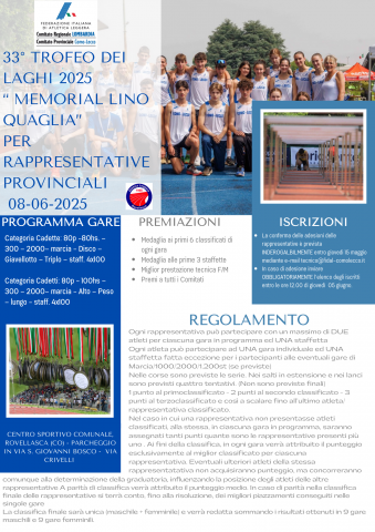 Il Fiduciario Tecnico provinciale Comolli Simone ha convocato gli atleti riportati nell'elenco allegato che faranno parte della rappresentativa Cadetti/Cadette in occasione del 33° TROFEO DEI LAGHI - MEMORIAL LINO QUAGLIA, previsto domenica 8 giugno a Rovellasca.